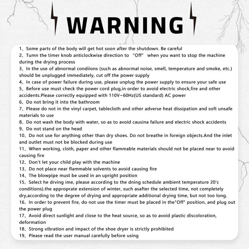 Care and Service: The shoe dryer needs to be used in a flat and dry ground, after drying, unplug the power in time; If you have any questions about our products, please feel free to contact us and we will solve it for you as soon as possible